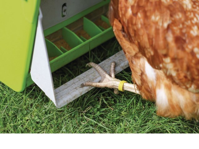 Der höhergelegte Tritt kann mittels Federmechanismus ganz einfach von kleinen und großen Hühnern gedrückt werden, wohingegen Schadnagern, wie Mäusen oder Ratten, der Zugang zum Futter erheblich erschwert wird.
